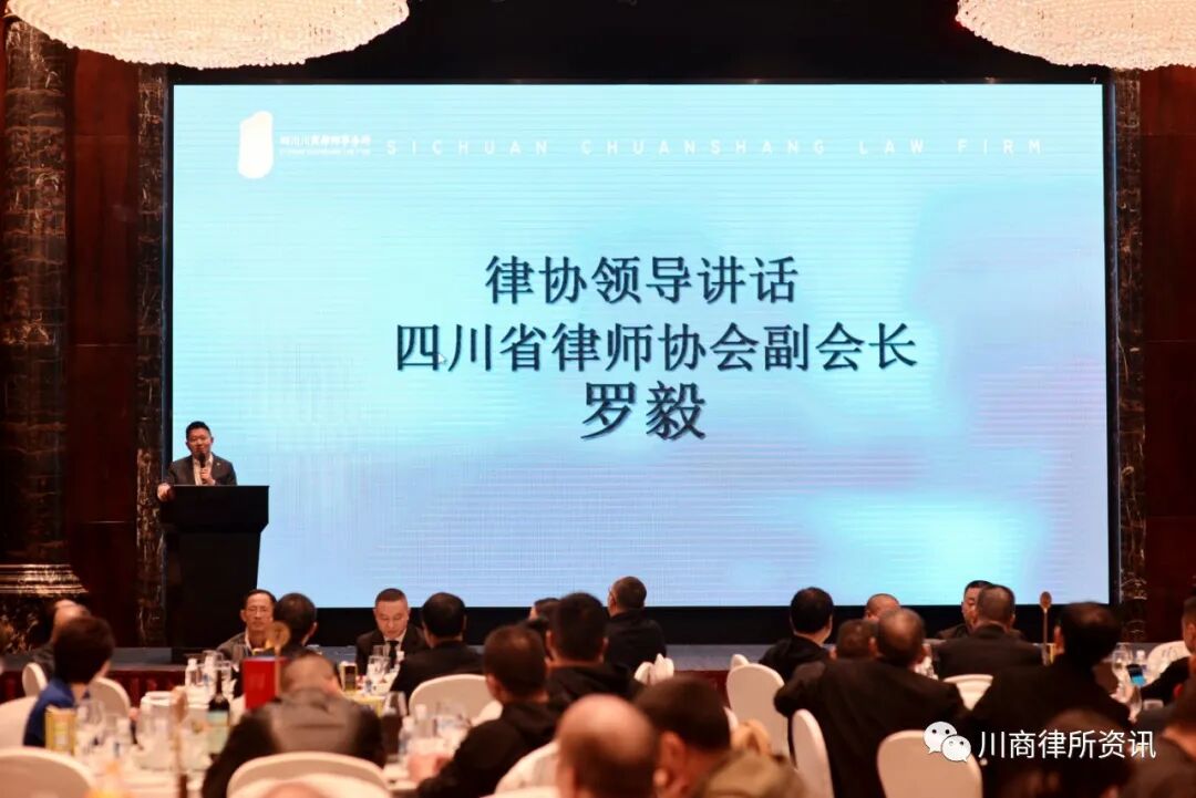 庆典上,律所主任张义文总结了律所十年来的历程和取得的成绩,他在会上讲到:"过去的十年,是奋发有为的十年。特别感谢十多年来一直支持川商发展的各界朋友。十年铭记奋斗的艰辛,时代印证前进的脚步。我们收获了许多成功与喜悦,我们经历了无数挫折与失败。一路走来,我们始终坚持一件事接着一件事办、一年接着一年干。吃苦耐劳、团结拼搏是川商人独一无二的精神,我们的努力和团结换来的是川商的稳步向前。正是川商人这种精神,让我们每一步都走得从容淡定、铿锵有力!" 然后展望了未来发展远景。紧接着四川省律师协会副会长罗毅,成都市工商联副主席、成都投融资商会会长向忠分别致辞。
